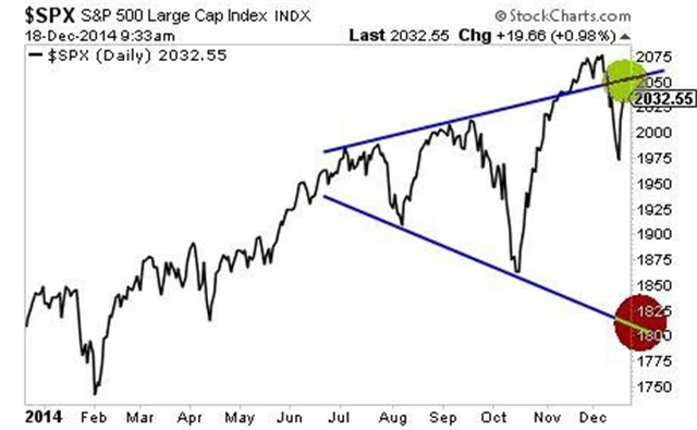 Akcie se pouze vzácně pohybují jen jedním směrem. Trhy od července formují takzvanou formaci "megafon". Od půlky listopadu trvá falešný nástup vzhůru. Teď se ale blížíme k důležité hranici, která se zřejmě ukáže jako rezistence. Index S&P 500 se tak může dostat k 2 050 bodům (zelený kruh v grafu), pak ale přijde prudký pohyb dolů k 1 800 bodům (červený kruh).