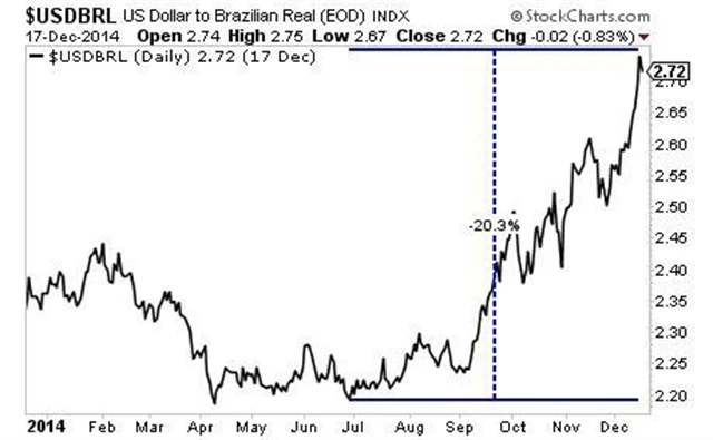 První fáze tohoto fenoménu už nastala. Podívejte se, jak za posledních 6 měsíců dopadl k dolaru brazilský real. Pro brazilskou měnu to byla krvavá lázeň. Mluvíme o poklesu o 20 % za půl roku.