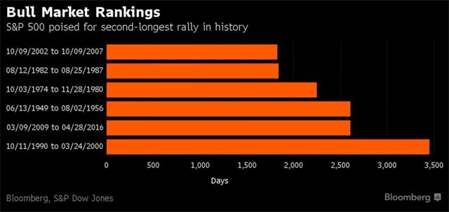 Býčí trend amerických akcií, který začal v březnu 2009, dosud přerušen nebyl, a v uplynulém týdnu se v seznamu nejdelších býčích trhů dokonce posunul na druhou příčku za růstové období, které trvalo od října 1990 do března 2000. Již třikrát to sice v poslední době se současnými býky bylo nahnuté (v posledních 19 měsících index S&P 500 zažil tři dílčí více než 10% poklesy), ale růstové období (ohraničené zvýšením cen akcií z lokálního minima o 20 %), které začalo sedm týdnů po nástupu Baracka Obamy do funkce amerického prezidenta, trvá již více než 2 600 dní.