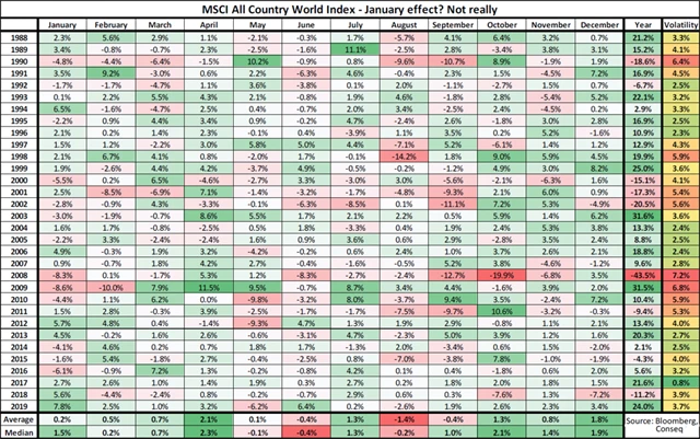 Data o globálním akciovém indexu MSCI All Country World od začátku roku 1988 ovšem ukazují něco jiného. Leden je sice mírně nadprůměrný a obvykle kladný měsíc, nicméně například duben, říjen a prosinec jsou v průměru daleko ziskovější.