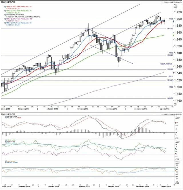 1 700 psychologická úroveň, 1 692 20denní (exponenciální) klouzavý průměr, 1 671 lokální vrchol z května 2013, 50denní (exponenciální) klouzavý průměr, 1 600 psychologická úroveň.