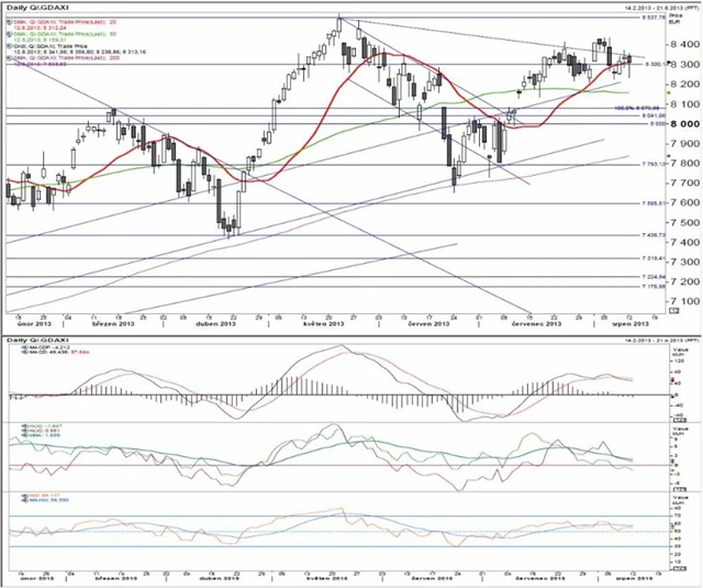 Technické indikátory jsou celkově lehce negativní, především kvůli negativnímu MACD. Pro další vývoj budou nadále klíčové aktuální hodnotě nejbližší trendové linie. Shora okolo 8 320 bodů a zespodu okolo 8 210 bodů.