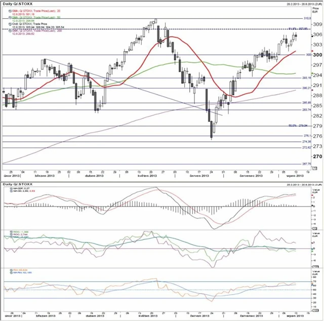 Technické indikátory jsou celkově mírně pozitivní, což by indexu mělo pomoci se udržet okolo 300bodové úrovně. Na druhou stranu RSI je už celkem vysoko a nenabízí velký prostor pro růst. Očekáváme, že index v průběhu tohoto týdne otestuje nejbližší rezistenci na 308 bodech. Její překonání by otevřelo cestu ke květnovému lokálnímu vrcholu okolo 311 bodů.