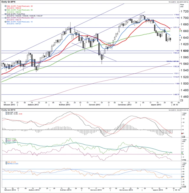 Celkově jsou technické indikátory jasně negativní. Očekáváme, že index bude mít nadále tendenci k pokračování poklesu. Z té by ho mohlo dostat případné úspěšné testování 50denního klouzavého průměru (zelená linie, okolo 1 661 bodů).