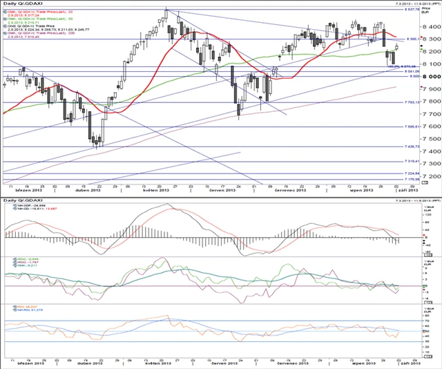 8 538 historický rekord z května 2013, 8 317 20denní (exponenciální) klouzavý průměr, 8 300 lokální dno, 8 270 klesající dlouhodobá trendová linie, 8 220 50denní (exponenciální) klouzavý průměr, 8 000 psychologická úroveň, 7 919 200denní (exponenciální) klouzavý průměr.