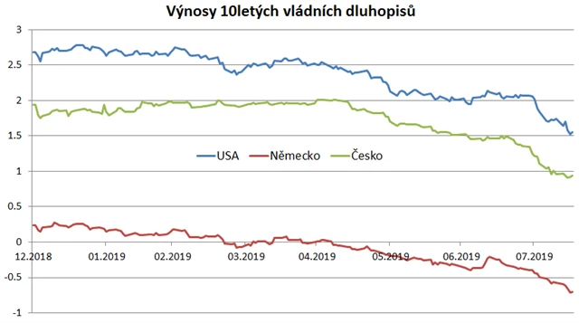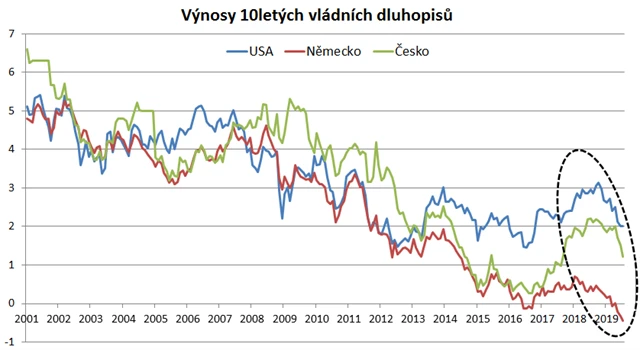 Na dluhopisových trzích v posledním období zrychlil dlouhodobý trend poklesu výnosů (a tedy růstu cen) na rekordní úrovně. Americký, německý a český 10letý výnos se v roce 2001 pohyboval okolo 5-6 %, v současnosti jsou ale výnosy dramaticky níže.