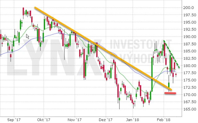 Vyznačená rezistence je úrovní, od které budeme časovat vstup. Čekáme na její proražení, nakupovat budeme na 181,50 EUR. Cílíme až na úrovně předchozích maxim, stop-loss pokládáme pod poslední minima.