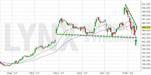 Aktuálně testuje dno, technicky klíčovou úroveň. V případě proražení níže se dlouhodobý růstový trend stane minulostí, pokud support vydrží, nabízí se příležitost k nákupu. Do pozice budeme vstupovat na 45,30 USD a cílit budeme na 51 USD. Stop-loss pokládáme pod poslední minimum na 41,80 USD. Prorazí-li kurz dříve tuto hladinu, od vstupu upouštíme.