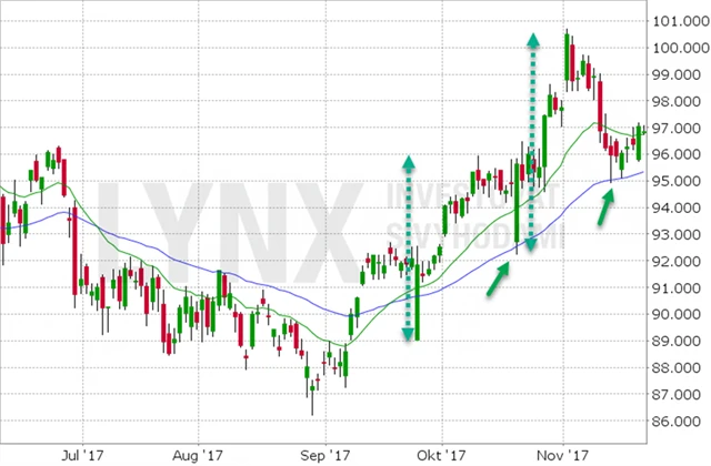 Protože odraz o klouzavého průměru již proběhl, budeme vstupovat limitním pokynem na 97 EUR. Stop-loss položíme pod delší klouzavý průměr na 94,70 EUR, se ziskem míříme na 103 EUR.