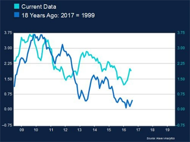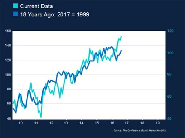 Když byla spotřebitelská důvěra v roce 1999 vysoká, o rok později dosáhla vrcholu před následným strmým propadem. Podobný scénář by znamenal pokles v první polovině roku 2018. "Na základě aktuálních údajů se zdá, že důvěra je na vrcholu. Ačkoli nevidíme žádné známky výrazného poklesu, další růst je jen málo pravděpodobný," říká McMillan.