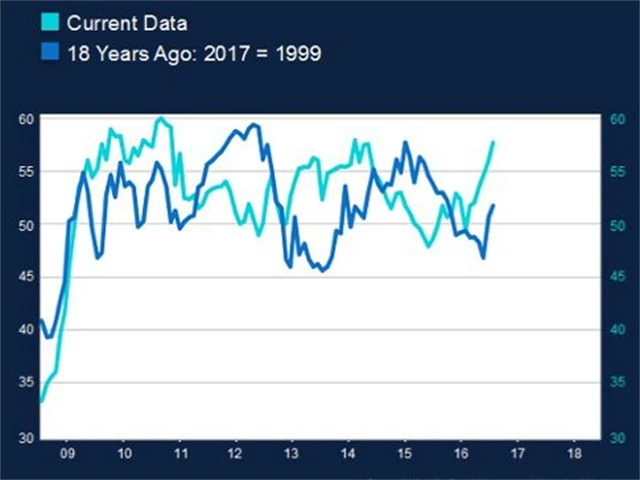 Také další ukazatel aktuálně dosahuje vrcholu, ale stabilizuje se. Kdyby došlo na podobný scénář jako v roce 1999, výrobní index ISM by podle McMillana mohl začít klesat někdy na začátku roku 2018.