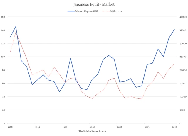 Připomeňme si vývoj v Japonsku. Tamní akciový index Nikkei 225 je i třicet let po svém hlubokém propadu jen na zhruba dvou třetinách maximální hodnoty. A to přesto, že tržní hodnota akcií je podobně jako v době vrcholu na burze na zhruba 140 % velikosti ekonomiky země.