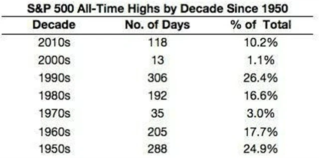 Jak již bylo naznačeno, výskyt rekordů není rovnoměrný. V některých dekádách, například v 90. letech (díky nafukování technologické bubliny), jich bylo více, jindy méně. Mezi roky 1973 a 1980 na trhu nenastalo nové historické maximum, podobně jako mezi roky 2000 a 2007, protože burzy se v té době vzpamatovávaly z hlubokých propadů.