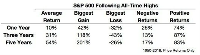 Ještě zajímavější je pohled na to, jak se trhům dařilo po dosažení historických maxim. Následné tříleté i pětileté výnosy jsou vlastně podobné jako dlouhodobé průměry. Ve většině případů se po historickém maximu trhy pohybovaly dále vzhůru. Je to logické, akciové trhy historicky dlouhodobě neznají jiný směr než "severní".