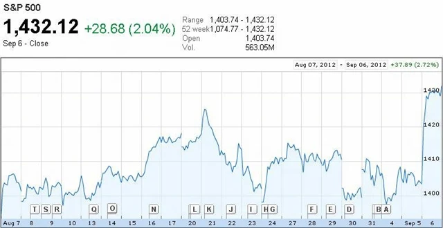 Americké akcie překonaly svá letošní maxima. Kromě pozitivních makrodat z USA jim k tomu dopomohla především vlna optimismu, kterou vyvolal šéf ECB Mario Draghi, který naplnil očekávání investorů a oznámil spuštění nového programu odkupu evropských dluhopisů. Zda to bude znamenat dlouhodobější růstový impulz pro trhy, teprve uvidíme, zatím se statistici mohou radovat z nového rekordu - 1 430 bodů indexu S&P 500 je meta, kterou trhy nepamatují několik let.