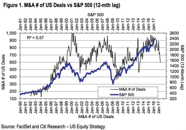 Podle Citigroup by investoři neměli ignorovat zpomalení na trhu fúzí a akvizic (M&A), které trvá od roku 2015. K poklesu zájmu o nákupy firem často dochází, když narůstá nejistota v podnikatelské sféře. Že by Trump efekt naruby? To ale vysvětluje jen poslední půlrok a kousek. Historická korelace objemu uskutečněných fúzí a akvizic s výkonem akciového indexu S&P 500 je známá věc.