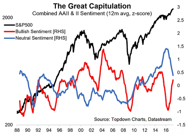 Podle průzkumů nálady mezi investory se zdá, že mnoho těch, kdo dlouho odolávali pozlátku probíhajícího býčího trendu, zůstávali mimo trh nebo jen s malým podílem akcií v portfoliu, nyní kapitulovalo a chce se svézt na pokračujícím růstu cen. To samozřejmě může živit rally, ale jak dlouho? Ocenění akcií je druhé nejvyšší v historii, řada ukazatelů je dokonce na rekordech. Třeba v Bank of America Merrill Lynch už se ve světle klidu na akciovém trhu ptají, jestli všeobecná pohoda není varováním a argumentem pro kontrariánskou, aktuálně tedy medvědí sázku.
