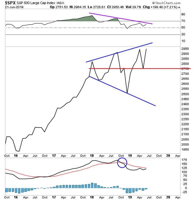 Tentokrát na to jde přes technickou analýzu. Konkrétně maluje do měsíčního grafu amerického akciového indexu S&P 500. Na prvním obrázku jsou kromě kurzu také indikátory MACD a RSI. První naznačuje prodejní signál, byť již poměrně starý. U RSI je však jasná divergence, kdy při každém maximu cen akcií stoupl index relativní síly pouze na nižší vrchol. S&P 500 samotný pak vytvořil nepříliš běžný obrazec megafonu s vrchní trendovou čárou velice blízko úrovní, na nichž se momentálně obchoduje.