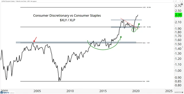 Podívejme se na jeden mimořádně optimistický graf. Optimistický pro ty, kteří věří v další růst cen amerických akcií. Jde o graf poměru cen akcií v odvětvích spotřebního zboží zbytného (discretionary) a spotřebního zboží nezbytného (staples).