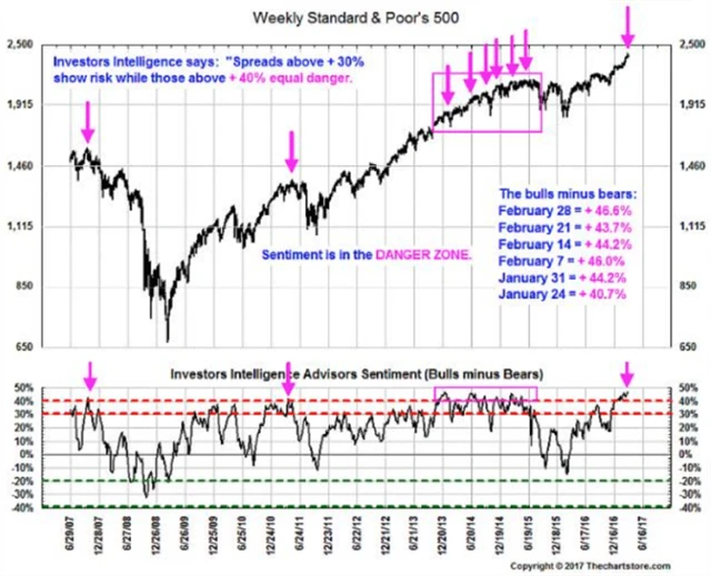 "Takzvaní insideři prodali v únoru akcie vlastních firem za 7,8 miliardy USD, což bylo nejvíce za zhruba šest let. Vědí snad něco, co my ne? Možná si všimli, že průzkum mezi obchodníky s futures ukázal na 92% míru býčí nálady. Od roku 2011 byl výsledek jen třikrát takto vysoký, přičemž vždy následovaly poklesy (o 7 % v únoru 2011, o 8 % v květnu 2013 a o 3 % v listopadu 2013). Na konci minulého týdne také znatelně ubylo akcií v indexu S&P 500 na nových ročních maximech. No a nakonec v grafu zobrazená obrovská převaha býků, ta nikdy nevěstí nic dobrého," upozornil v poznámce klientům Jeffrey Saut z Raymond James.