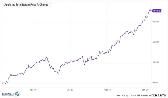 Akcie technologické společnosti Apple v loňském roce zpevnily zhruba o 85 %. A jejich růst pokračuje, v horizontu 12 měsíců zhodnotily při započtení dividend o více než 100 %. Jejich cena se ovšem zvyšuje dlouhodobě, třeba od roku 2000 vzrostla ze zhruba tří dolarů na více než stonásobek.