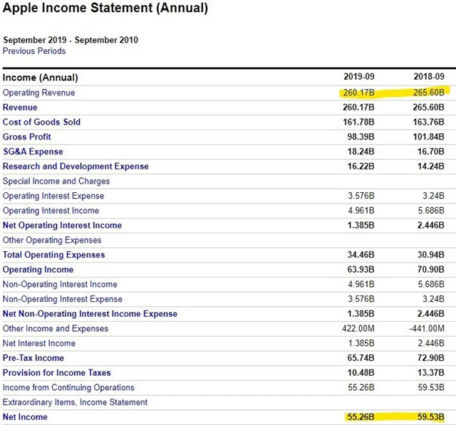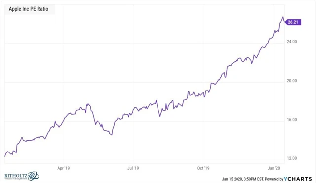 Jak ovšem upozorňuje Ben Carlson z Ritholtz Wealth Management, výše zmíněné P/E pracuje s historickými zisky společnosti. "Když se zaměříme na příští měsíce, tak optimistický obraz již neuvidíme," říká. Upozorňuje přitom na skutečnost, že tržby se firmě ve finančním roce 2019 meziročně snížily přibližně o pět miliard na 260 miliard dolarů a zisk jí ve stejném období meziročně klesl asi o čtyři miliardy na 55,3 miliardy dolarů.
