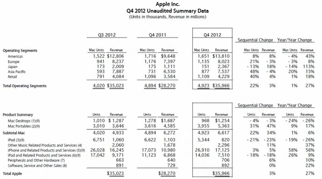 Tržby Applu dosáhly ve třetím čtvrtletí 2012 36 miliard USD (naplnil odhady), zisk na akcii 8,67 USD (čekalo se 8,81 USD). Firma prodala více iPhonů a méně iPadů, než se čekalo (26,9 vs. 25,3 milionu, respektive 14 vs. 15 milionů). Prodalo se i méně Maců a iPodů.