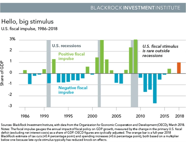 Americká ekonomika dostává bonus ve formě fiskálního stimulu, který navíc přichází mimo období recese. Veřejné výdaje a daňové škrty mohou podle Turnilla pomoci k růstu o jedno dodatečné procento. Rychlejší růst by mohl vést ke zkrácení cyklu, pokud by fiskální podpora nevedla k vyšší produktivitě. Snížení daní ale firmám umožňuje navýšit investice do nových technologií, což by mohlo vést ke zvýšení produktivity a v delším horizontu by to mělo zamezit přehřátí ekonomiky.