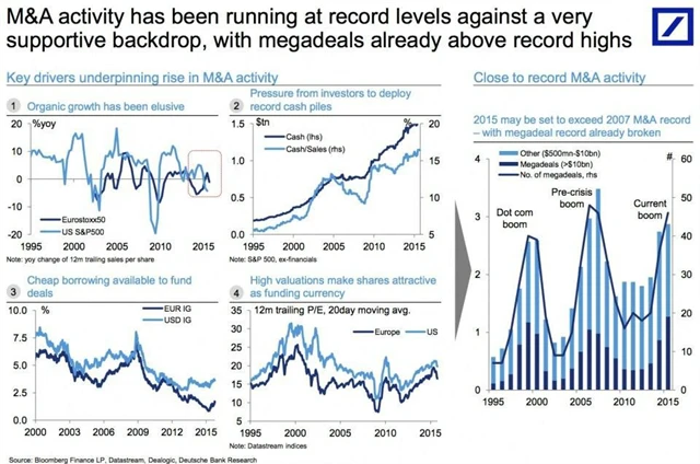 Podle ekonomického týmu z Deutsche Bank je však tento vývoj v oblasti M&A celkem logický. Jelikož je (organický) růst firem nejistý, investoři chtějí, aby podniky nahromaděnou hotovost nějak využily. Ocenění akcií je sice poměrně vysoké, peníze ale byly levé, což z nich dělá dobrý zdroj financování akvizic. Sečteno a podtrženo, rekordní objemy v oblasti fúzí a akvizic z roku 2007 mohou být překonány, uvádějí experti z Deutsche Bank.