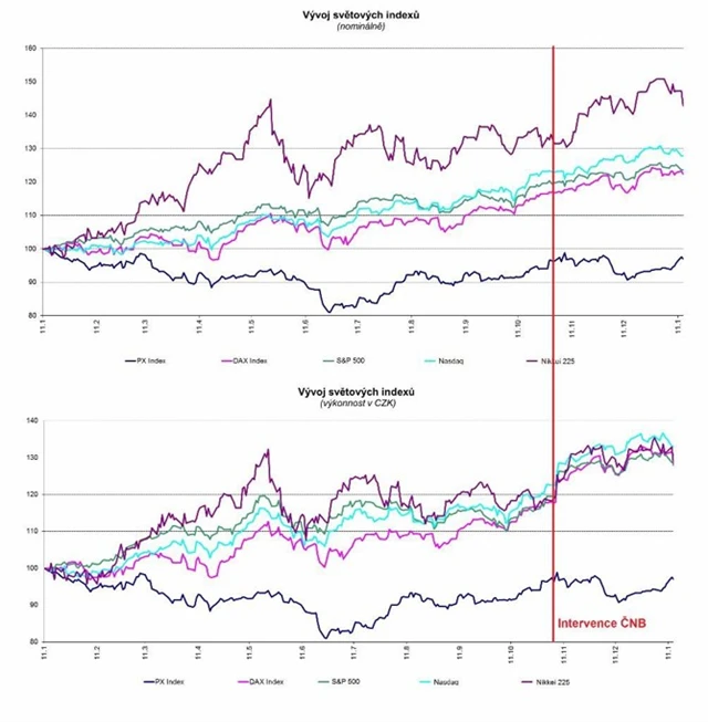 Pražská burza za poslední rok výrazně zaostala za zahraničními trhy. Čechům se tak vyplatilo nakupovat akcie mimo pražskou burzu - v Japonsku, Evropě nebo USA. Výnosy ze zahraničních akcií přitom svým zásahem proti koruně výrazně umocnila ČNB.