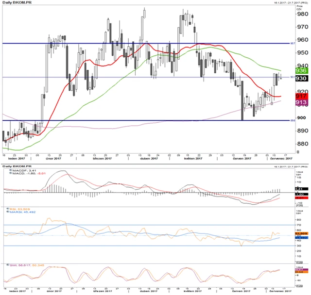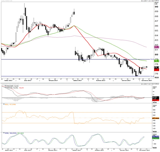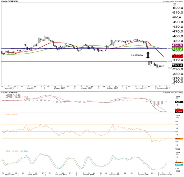 Akcie jsou od zániku práva na dividendu prakticky bez života a obchodují se v pásmu několika korun. Pochopitelně nepomáhá ani absence zpráv. Výsledky společnosti za druhé čtvrtletí budou známy 8. srpna, do té doby se nelze příliš spoléhat na bujarou aktivitu investorů. Očistíme-li cenu akcií o pokles způsobený připsaním dividendy, obchodují se nyní pod pásmem, v němž se pohybovaly v minulých týdnech. Technická analýza přitom nenabízí scénář, ve kterém by mělo dojít k zásadní změně.