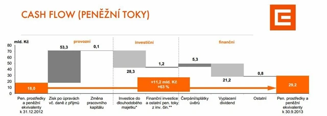Proti tomu je ale potřeba si uvědomit, že rokem 2014 končí pro ČEZ šestileté období intenzivních investic do nových výrobních zdrojů v ČR (35 až 40 miliard Kč ročně). Ty podle Šnobra poklesnou na úroveň 10 miliard Kč ročně. "Z pohledu cash flow bude tedy pokles EBITDA v roce 2015 kvůli slabším cenám silové elektřiny téměř dvojnásobně kompenzován poklesem kapitálových investic (CAPEX). Osobně navíc očekávám zrušení probíhajícího tendru na dostavbu Temelína, což tento vývoj ještě podtrhne. Věřím, že vzhledem k uvedenému může v letech 2015 až 2017 být reálná kromě výplaty běžné dividendy (výplatní poměr 50 až 60 % čistého zisku) i výplata slušné mimořádné dividendy," říká Šnobr.