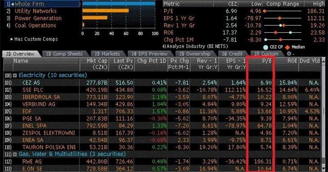 Výrazně nižší je i samotné ocenění akcií ČEZ. Pokud porovnáme ocenění firem v regionu CEE, zjistíme, že ČEZ patří k těm s nejnižšími hodnotami P/E.