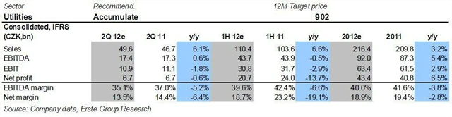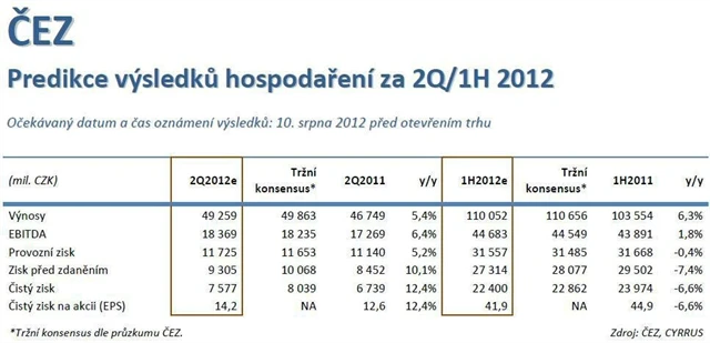 Společnost ČEZ by měla podle naší projekce ve 2Q2012 meziročně zvýšit čistý zisk o více než 12 % na 7,6 miliardy Kč, což by zároveň znamenalo snížení meziročního poklesu za první pololetí na 6,6 % oproti meziročnímu poklesu zisku v prvním kvartálu o 14 %. Předpokládáme, že pokud realita alespoň dosáhne naší projekce či o něco optimističtějšího tržního konsenzu, bude ČEZ na dobré cestě splnit celoroční cíle na úrovni EBITDA, EBIT i čistého zisku.