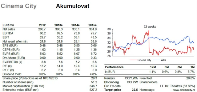 Cinema City (CCI) bude koncem srpna reportovat hospodářské výsledky za druhý kvartál. Ty budou podpořeny nedávnou akvizicí realitních aktiv a také 5,1% meziročním růstem sítě kinosálů. Tržby by podle našich odhadů měly vzrůst o 13 % a provozní zisk EBIT o 40 %. Na úrovni čistého zisku ale očekáváme stagnaci z důvodu vyšších úrokových nákladů. Ve druhé polovině roku čekáme mírné zpomalení z důvodu vyšší srovnatelné základny (v červenci 2012 společnost otevřela jeden ze svých klíčových projektů v Izraeli).
