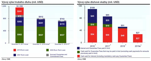 Pokles objemu peněz potřebných na obsluhu dluhu bude pokračovat i v roce 2019 a letech dalších. Především letošní rok je v této oblasti významný, mělo by dojít k poklesu této dluhové služby na asi 27 milionů USD. Tato položka byla v minulých letech hlavní brzdou růstu finančních výsledků firmy a neumožňovala výraznější snižování dluhu.