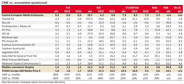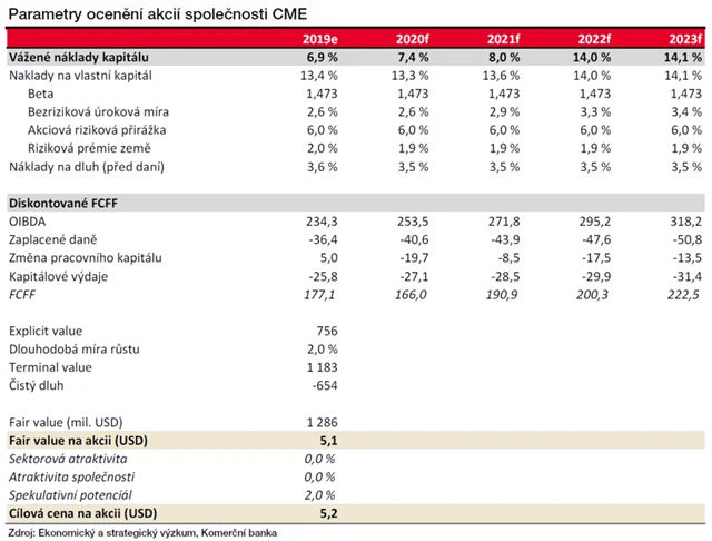 V sektorovém srovnání jsou akcie CME z dlouhodobého hlediska podhodnocené, ukazatele P/E a EV/EBITDA jsou pro rok 2019 na úrovni 6,2 a 2,8. Jejich hodnota pro srovnatelné společnosti v sektoru činí 12,1 a 6,6.