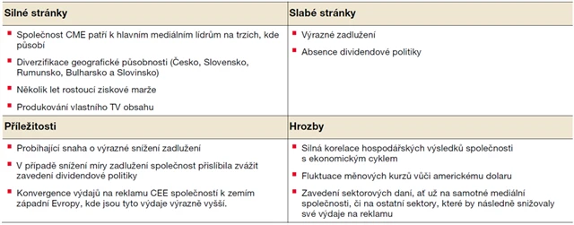 Zvyšujeme cílovou cenu akcií CME na 5,2 USD a ponecháváme doporučení "koupit". Předpokládáme, že pozitivní vývoj na mediálním trhu ve střední a východní Evropě a probíhající úsilí o snížení zadlužení povedou k pozitivnímu vývoji hospodářských výsledků společnosti, píše analytik Jiří Kostka z Komerční banky.