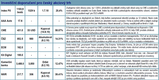 Index PX začínal v červnu na úrovni 1154 bodů. Mezitím dvakrátatakoval hranici 1200 bodů, aby se po zvýšené nervozitě na trzích vrátil k hladině 1103,9. Nejvyšší hodnoty 1185,4 bodu index dosáhl 21.6. Meziměsíčně si PX index odepsal 6,2 % a úroveň indexu se dostala 1,2 % pod začátek roku 2010 (první obchodní den otevíral PX index na 1117 bodech). jaký výhled dávají českému akciovému trhu analytici České spořitelny?
