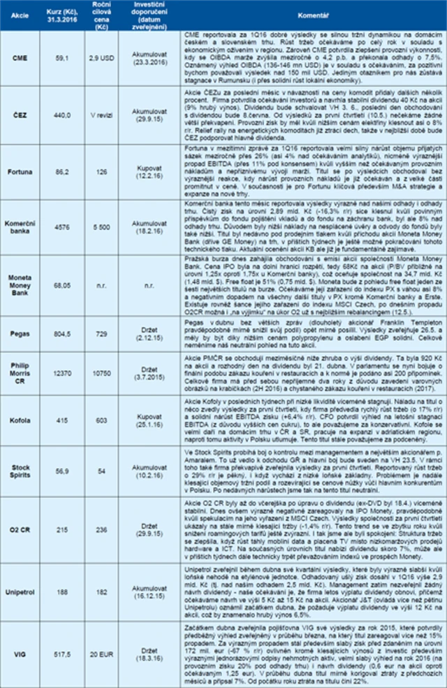 Poznámka: Tabulka nebyla aktualizována o páteční odpolední oznámení návrhu dividendy ze strany Unipetrolu. I proto připojujeme komentář analytika Petra Bártka z České spořitelny k modelovému portfoliu českých akcií, které banka sestavuje.
