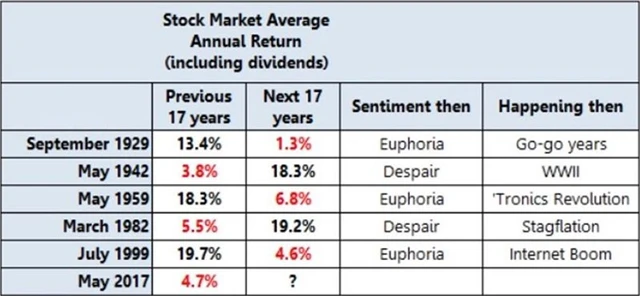 Elizalde přiznává, že může jít o náhodu, kterou odhalí budoucnost, tabulka ale působí zajímavě. Po euforii před rokem 1929 přišla studená sprcha a dalších 17 let bylo silně podprůměrných. Před rokem 1942 zase trhy (i díky dvěma recesím ve 30. letech) nevypadaly zrovna slibně, ale pak vydělaly téměř 20 % ročně. Tak to pokračovalo, a ačkoli vždy nešlo přesně o 17letý interval, euforie a odevzdanost se celkem pravidelně střídaly. Dalo by se říci, že jde o poměrně dobrý kontraindikátor, protože když euforie vrcholí, trhy čeká špatné období a naopak.