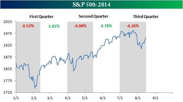 Graf indexu S&P 500 za rok 2014 hovoří jasně - první poloviny kvartálů pokles, druhé poloviny růst. Je to samozřejmě náhoda, ale je možné, že se akcioví býci v honbě za novými rekordy a metou 2 000 bodů budou ohánět i podobnými grafy.