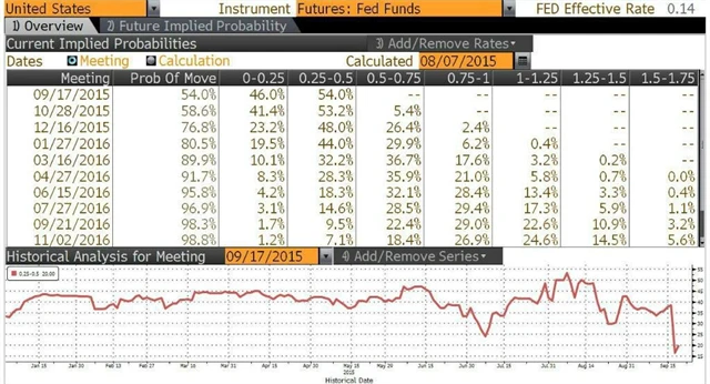 Příkladem akciovým děním ovlivněné politiky ze současnosti je Čína, kde centrální banka snížila sazby poté, co trh za dva dny odmazal 15 % své hodnoty, nebo Fed, který minulý čtvrtek kvůli nejistotě na trzích odsunul dlouho plánované první zvýšení úrokových sazeb od finanční krize. Začátkem srpna, tedy ještě před korekcí, trh utažení měnové politiky na zářijovém zasedání FOMC převážně očekával (jak je patrné z tabulky). Po akciové korekci rozpoutané devalvací čínské měny 11. srpna ale pravděpodobnost brzkého zvýšení sazeb Fedu dle očekávání trhu z 54 % rychle klesla až na zhruba 30 % těsně před zasedáním (jak lze vyčíst z grafu pod tabulkou).