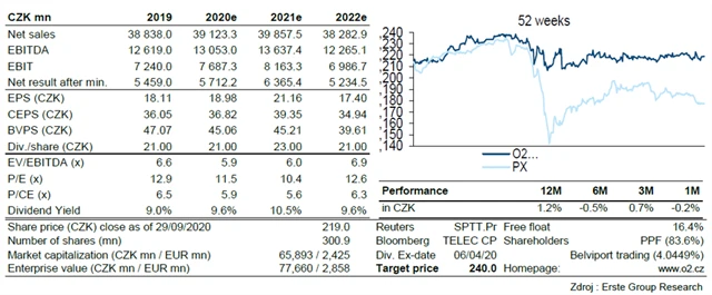 Erste Group Bank ponechala pro akcie společnosti O2 Czech Republic doporučení na úrovni "akumulovat" s 12měsíční cílovou cenou 240 Kč. Tato cena indikuje zhruba 10% růstový potenciál. Argumentem jsou nadále solidní tržby a citelné úspory nákladů.