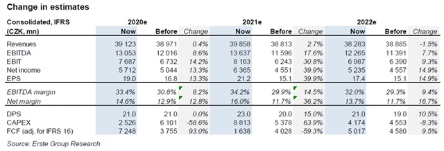 Celkově Erste odhaduje negativní dopad na hospodaření O2 za rok 2020 na úrovni 1-2 % v případě tržeb a okolo 4 % na úrovni EBITDA. Erste i tak zvyšuje výhled vývoje tržeb pro rok 2020-2021, a to zejména díky vyšším přírůstkům v segmentu placené televize a posunutí možného negativního vlivu vstupu dalšího operátora na trh až na rok 2022. Erste výrazně zvedla výhled pro EBITDA marži, který je založen na pokračující dobré kontrole nákladů v letošním prvním pololetí.