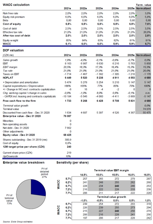 Rozvaha O2 Czech Republic je relativně komfortní s poměrem čistého dluhu a EBITDA na úrovni 0,9 (1H2020, bez leasingu). Erste očekává, že v letech 2020-2021 poměr při stabilním dividendovém výplatním poměru (90-110 %) a pokračující výplatě 4 Kč na akcii z emisního ážia nepřesáhne horní hranici cílovanou managementem na úrovni 1,5. Erste proto očekává dividendu na úrovni 21 Kč na akcii z letošního zisku a 23 Kč na akcii ze zisku za rok 2021.