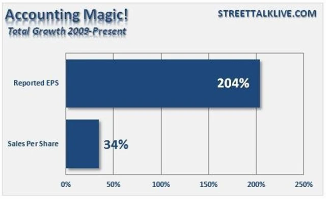 Od roku 2009 stoupl společnostem, jejichž akcie jsou zastoupeny v indexu S&P 500, zisk na akcii o 204 %, zatímco tržby na akcii se jim zvýšily jen zhruba o třetinu. Souhrnný rozdíl mezi upravenými a čistými zisky pak od roku 2010 do roku 2014 dosáhl asi 583 miliard dolarů, což je číslo, které by po přepočtení na jednotlivé firmy dalo každé z nich z pohledu čistého zisku v průměru kolem osmi měsíců k dobru.