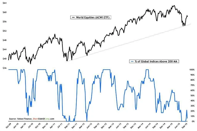 Graf ukazuje index MSCI All Country World včetně indikátoru šířky trhu. Ten sleduje podíl těch nejdůležitějších globálních indexů, které jsou aktuálně nad svými 200denními klouzavými průměry. Je jich minimum.
