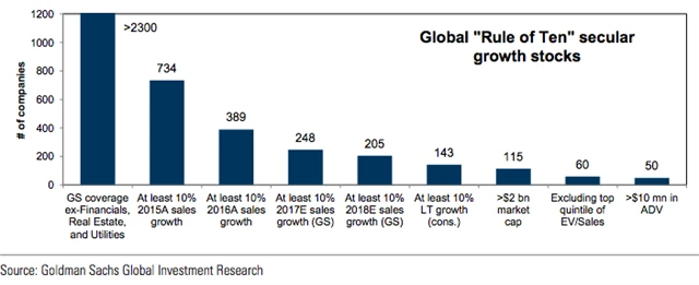 Goldman Sachs pro své klienty sestavila seznam 50 firem, které mohou být pro ně zajímavé v současném prostředí. To je charakterizováno pomalým, nevýrazným růstem, ideálním pro společnosti, které dokáží udržet vlastní růst bez pomoci zvenčí. "Růstové firmy zpravidla dosahují nadvýkonnosti v prostředí se solidní, ale nepříliš zajímavou ekonomickou aktivitou," tvrdí David Kostin, který vede tým akciových stratégů v Goldman Sachs.
