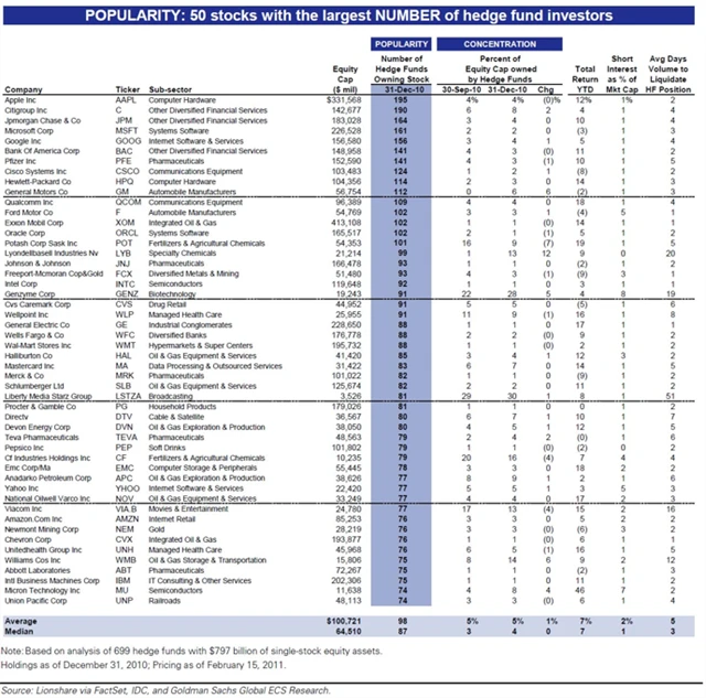 Největším překvapením je, že výrobce iPodu a iPhonu, společnost Apple (AAPL) už není nejčastěji drženou akcií. Na konci roku 2010 drželo tuto technologickou akcii dohromady 195 hedgeových fondů, mimochodem na druhém a třetím místě byly bankovní domy Citigroup a JPMorgan Chase. Po třech měsících 22 fondů pozici v Applu kompletně uzavřelo.